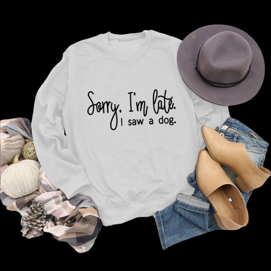 "Sorry I'm Late. I Saw a Dog." Funny Women's Long Sleeve Crew Neck Tee Shirt Top in Assorted Colors for Dog Lovers