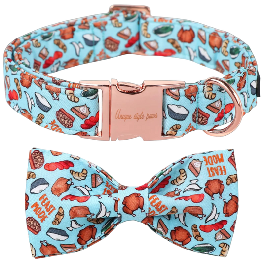 "Feast Mode" Thanksgiving Day Dog Collar with Bow, Turkeys, Pies, and All the Sides Turkey Day Pet Fashion