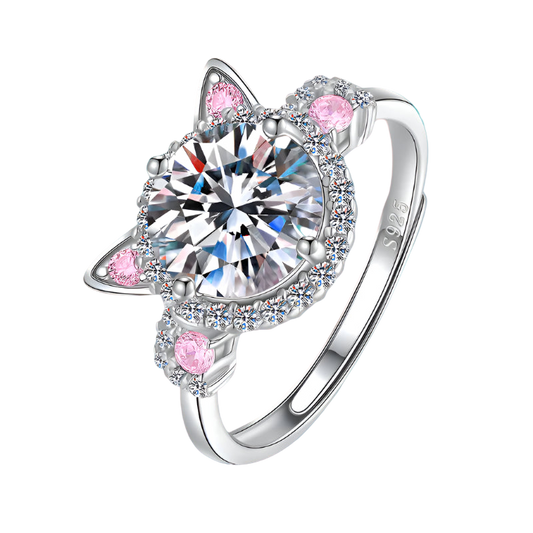 Cute Pink and Clear Crystal Real Silver Kitten Adjustable Open Ring for Women and Girls Cat Lovers Gift