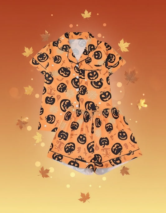 Halloween Satin Pajama Set in a variety of fun spooky October pumpkin and ghost prints