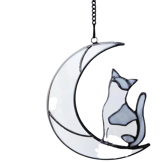 2 Options, Tabby or Shorthair-Stained Glass Suncatcher Hanging Gray and White Cat sitting on a Crescent Moon Memorial Gift, Sympathy Gift for Cat Loss or Cat Lovers