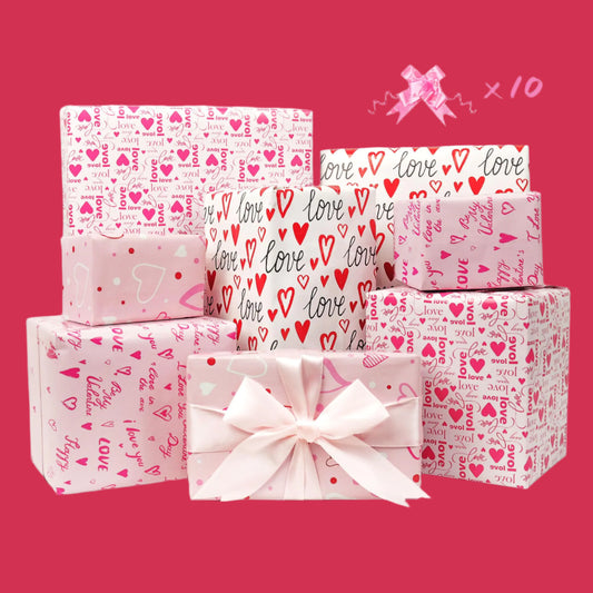 12 Sheets Heart Pattern Valentine's Day, Wedding, Anniversary Gift Wrapping Paper with 10 Pink Bows