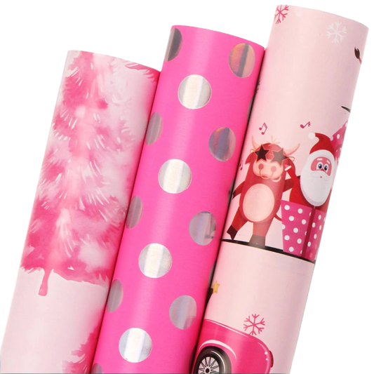 Pretty Soft Pink Christmas Gift Wrap in 3 Styles, Santa, Silver Polka Dot, and Whimsical Tree for Holiday Presents