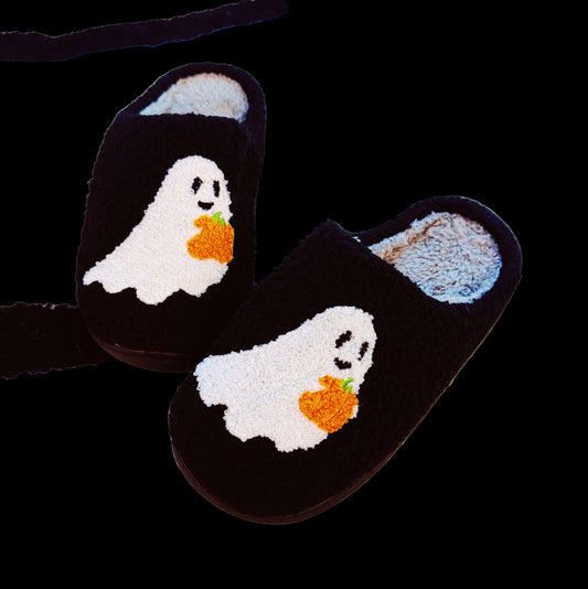 Spooky Ghost Cozy Slippers – Soft Black Slippers With Cute Ghost and Pumpkin