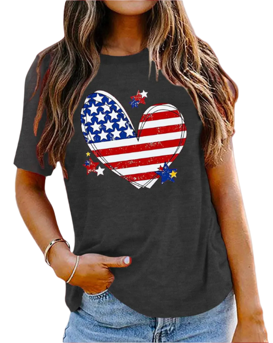 Stylish Women's Dark Gray American Flag Heart Short Sleeve Tee Shirt for Patriotic Parties and 4th of July