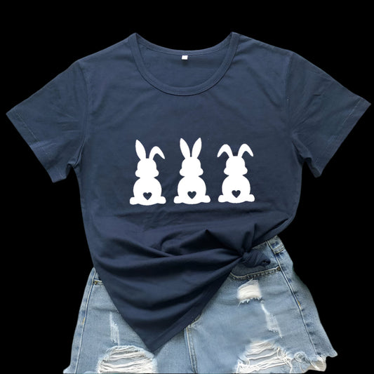 Women's Cute Easter Bunny Short Sleeve Tee Shirt Three Rabbits with Heart Tails Assorted Colors