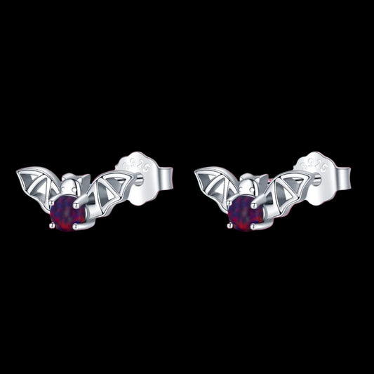 White Gold Plated 925 Sterling Silver and Red Opal Gemstone Bat Earrings Halloween Jewelry