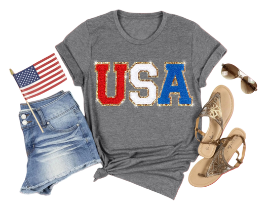 Women's Red, White, and Blue lettering with Sparkling Gold Sequin Outline USA Fancy Tee Shirt for Fourth of July or Patriotic Parties