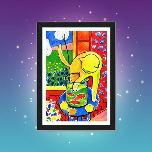 • Colorful painting of a cat looking into a fishbowl with a vibrant background