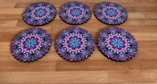 6 Pack Turkish Wooden Coaster Set with Holder - Purple Tone Floral Mandala -- Made in Turkey