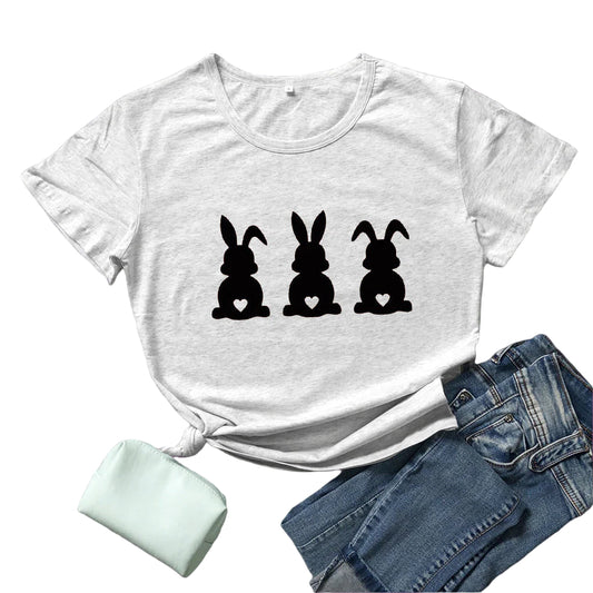 Women's Cute Easter Bunny Short Sleeve Tee Shirt Three Rabbits with Heart Tails Assorted Colors