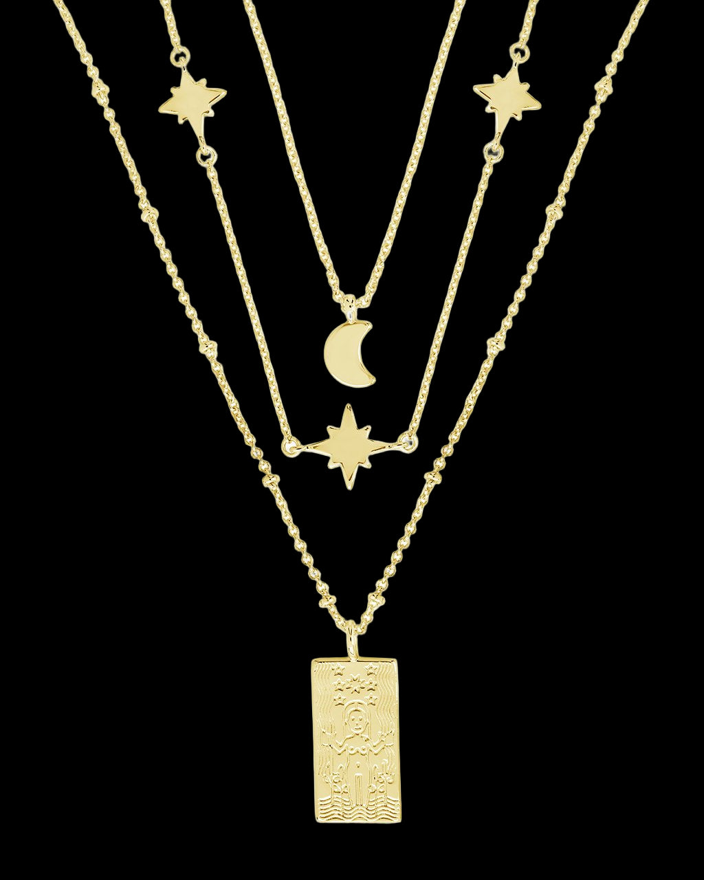 All eyes will be on you when you're wearing this celestial beauty! It features layers strung with moon and star charms, and is finished off with a tarot card charm. Available in gold and silver tones.